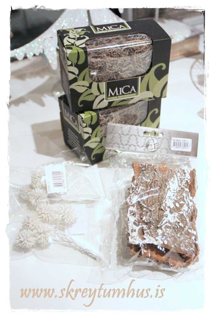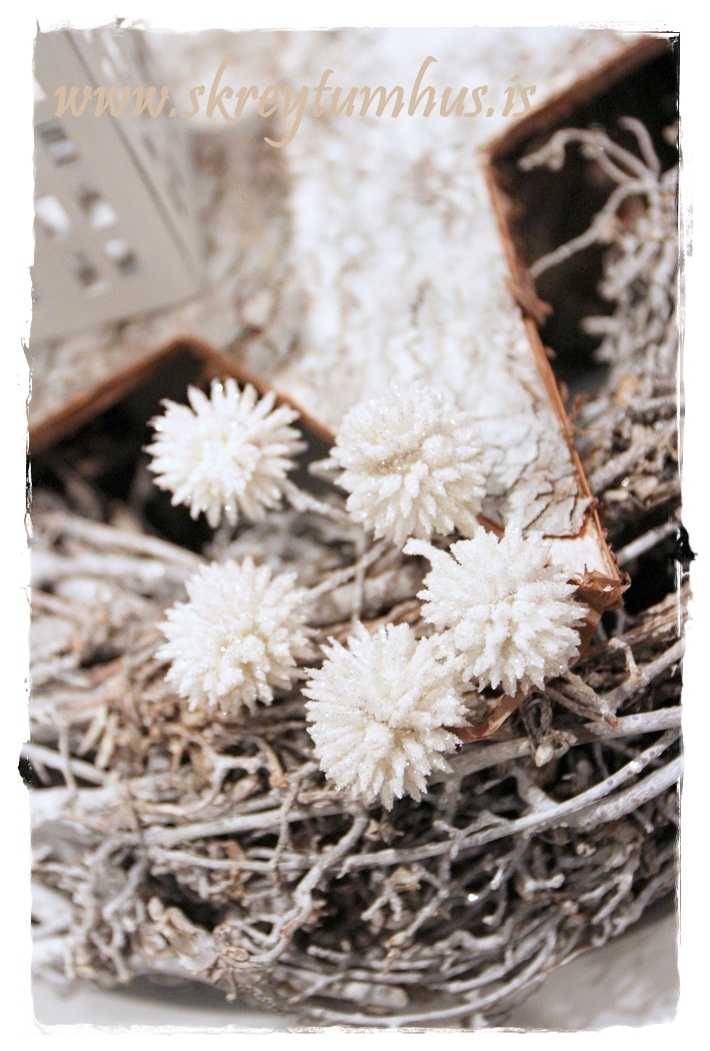 …skinn-jólakúlur og mosi, börkur og litlar hvítar glitrandi broddakúlur…