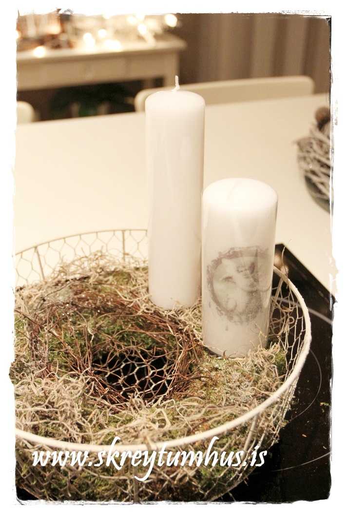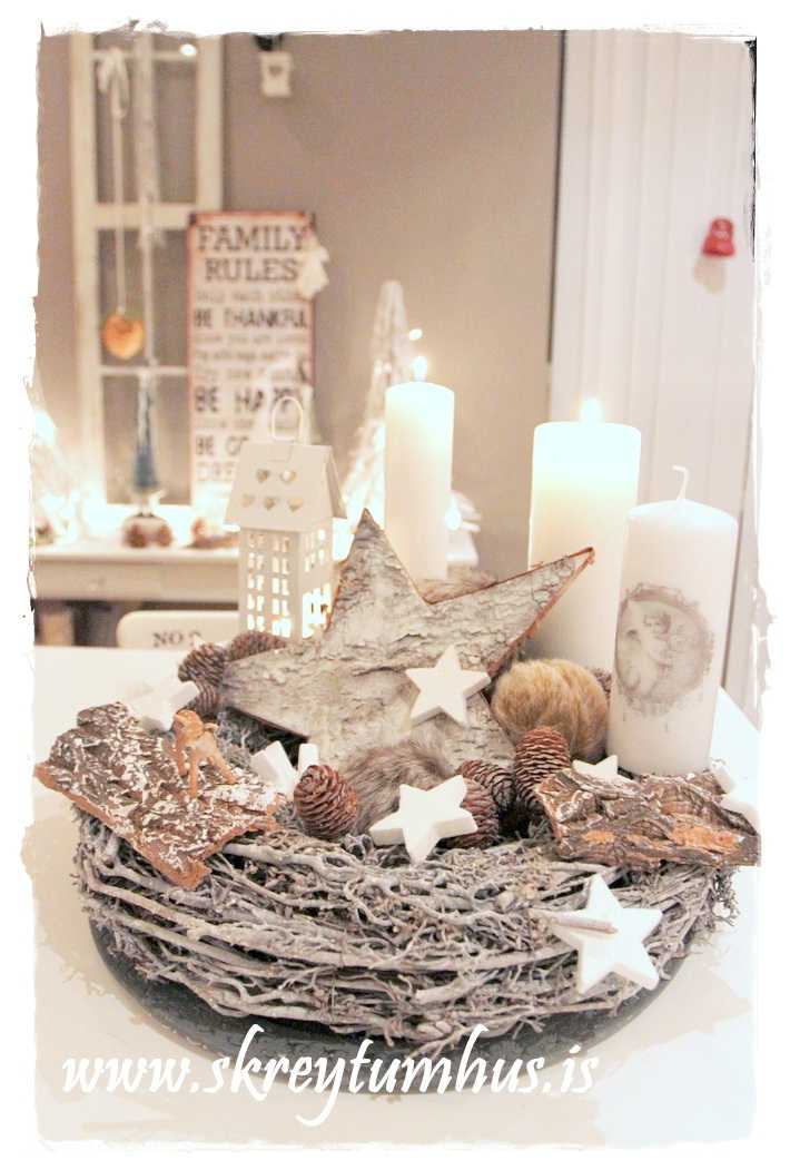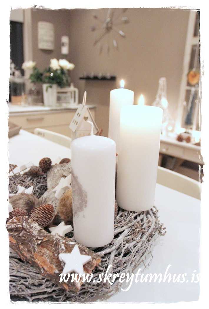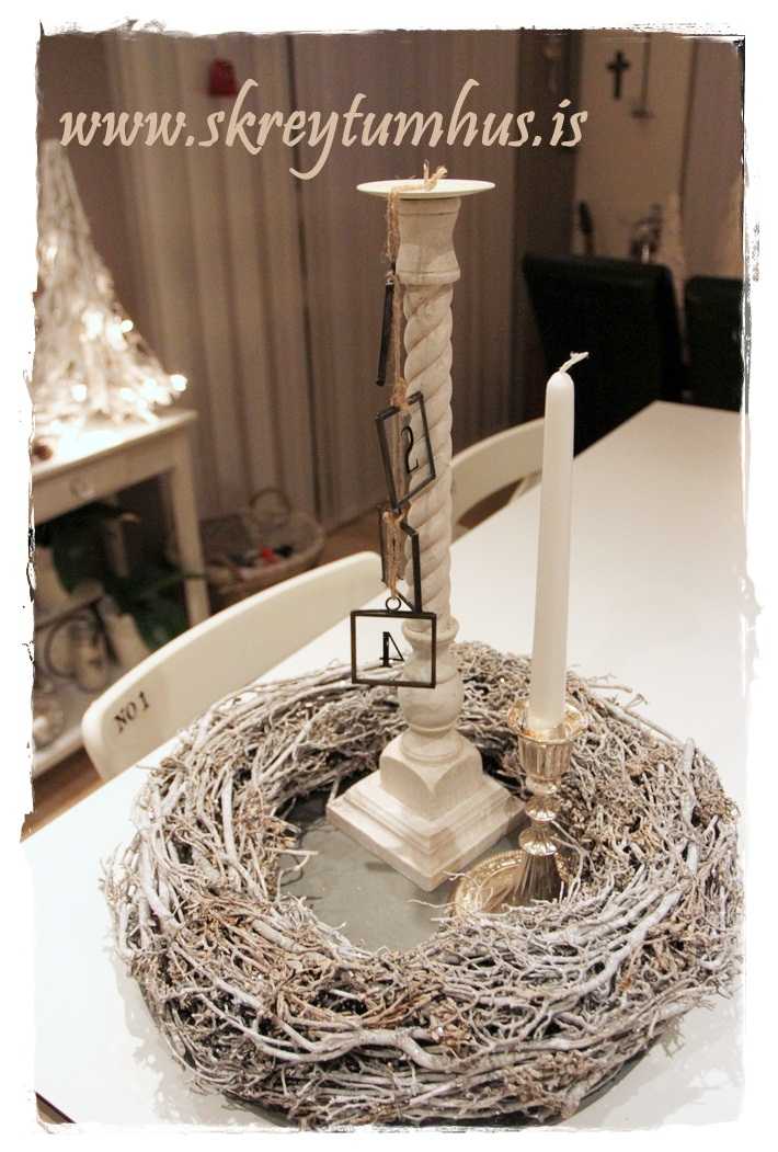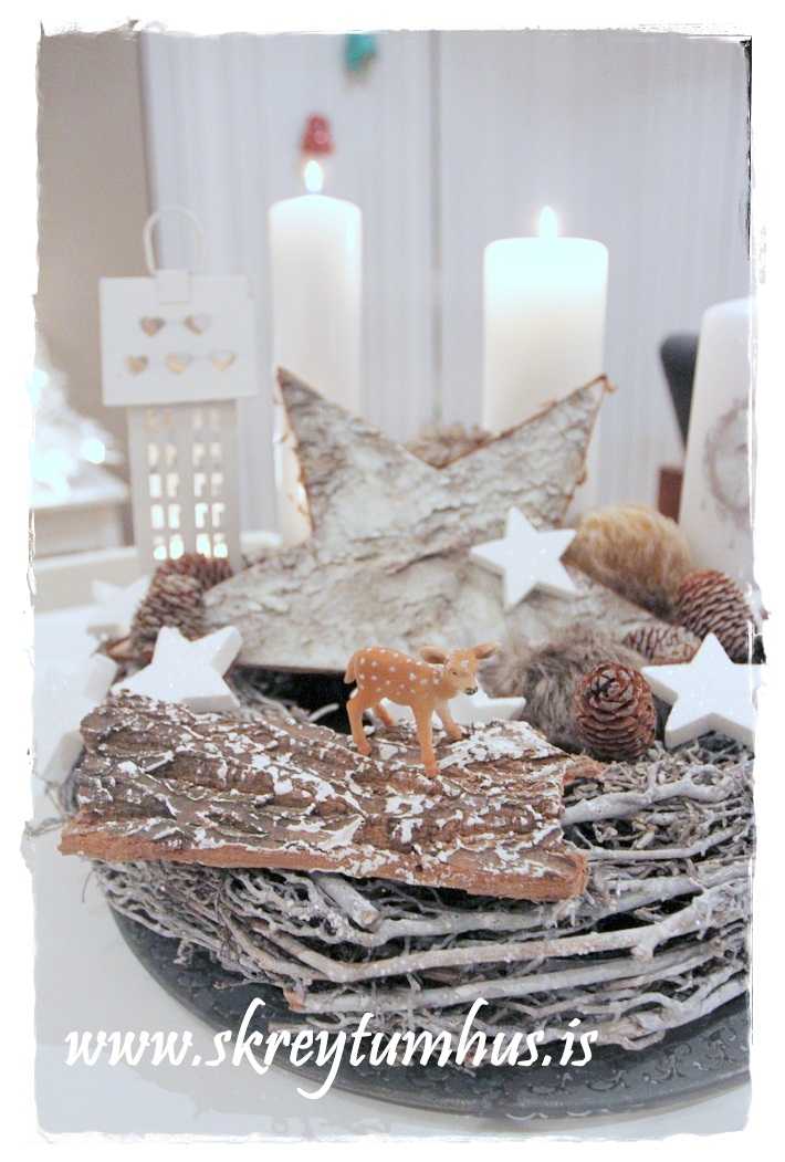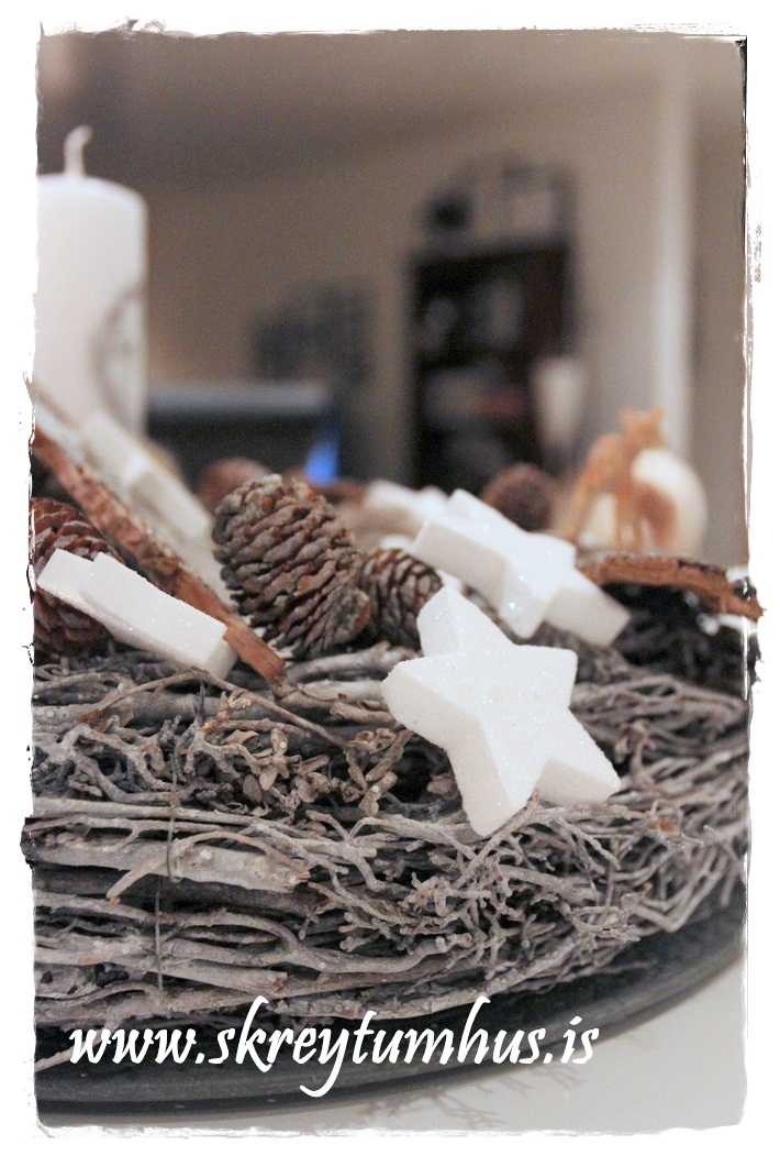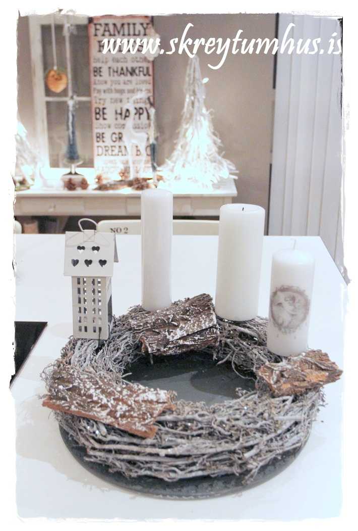 …fallegi grái kransinn mættur til leiks, og ég festi á hann kertin og kertahúsið, ásamt því að setja börk hér og þar…