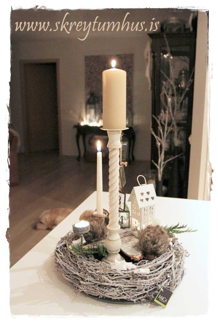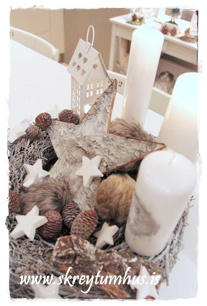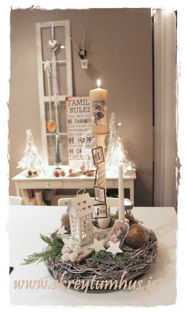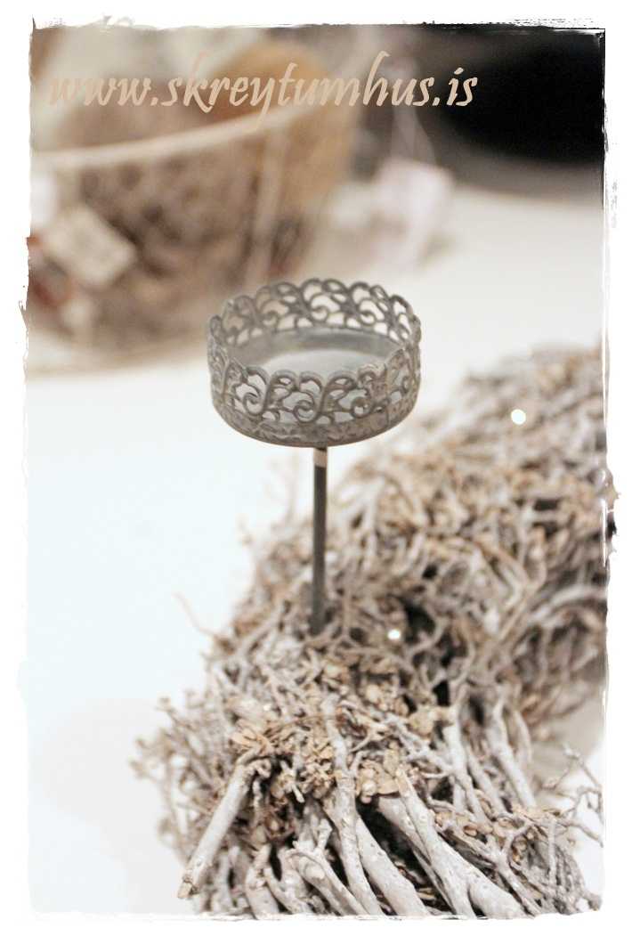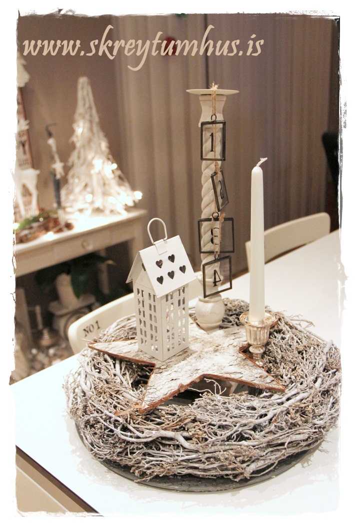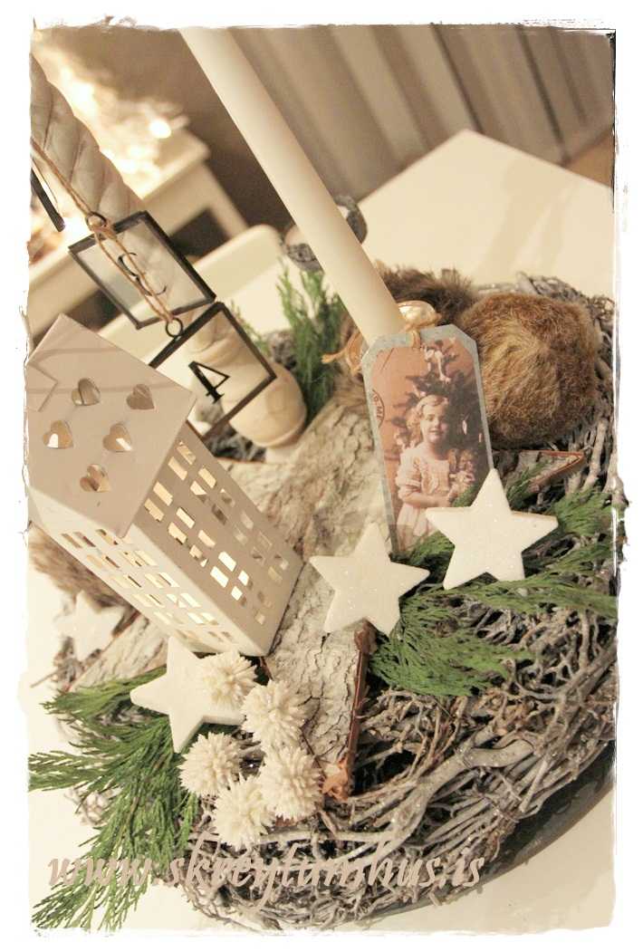 …fallegi grái kransinn mættur til leiks, og ég festi á hann kertin og kertahúsið, ásamt því að setja börk hér og þar…