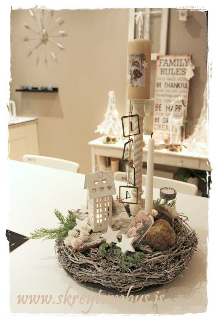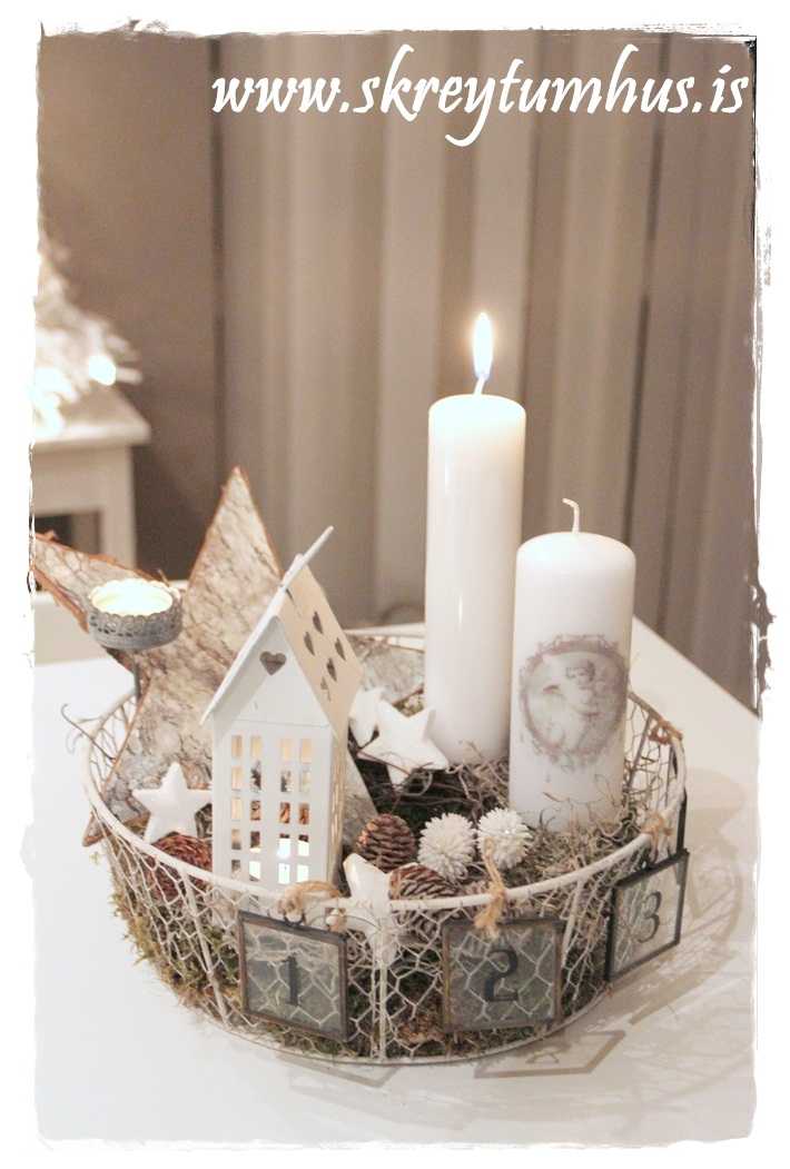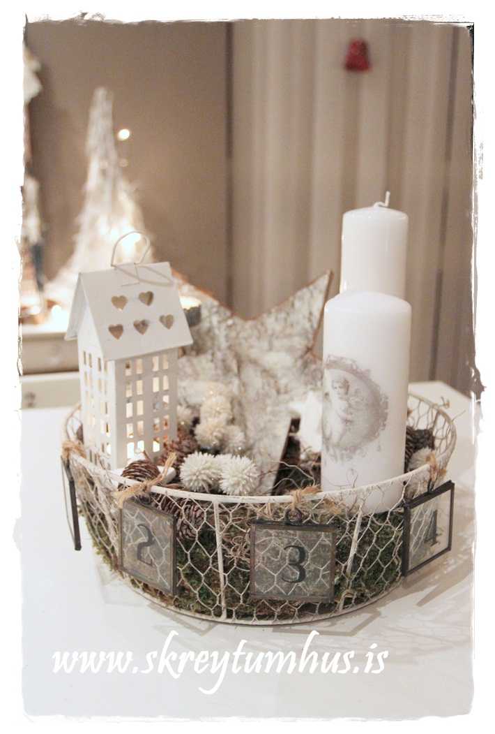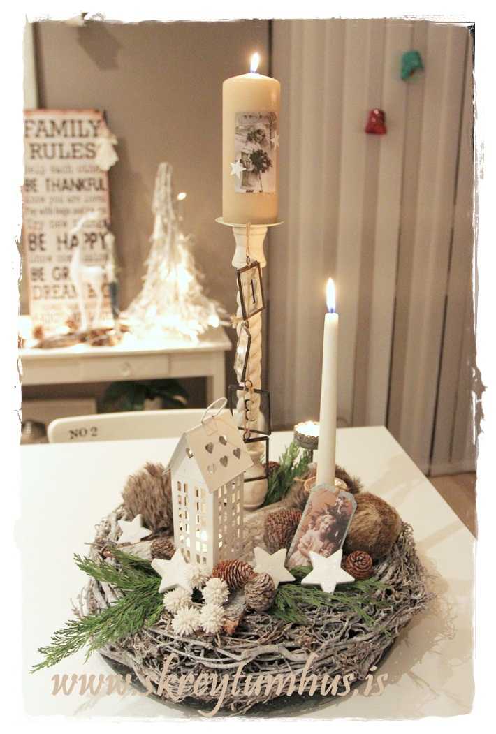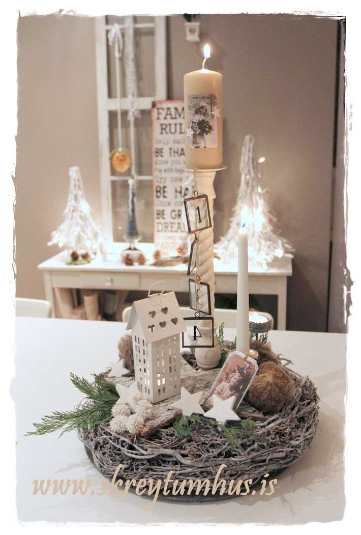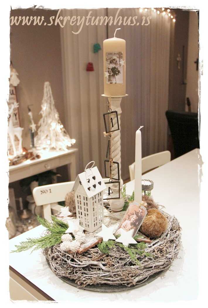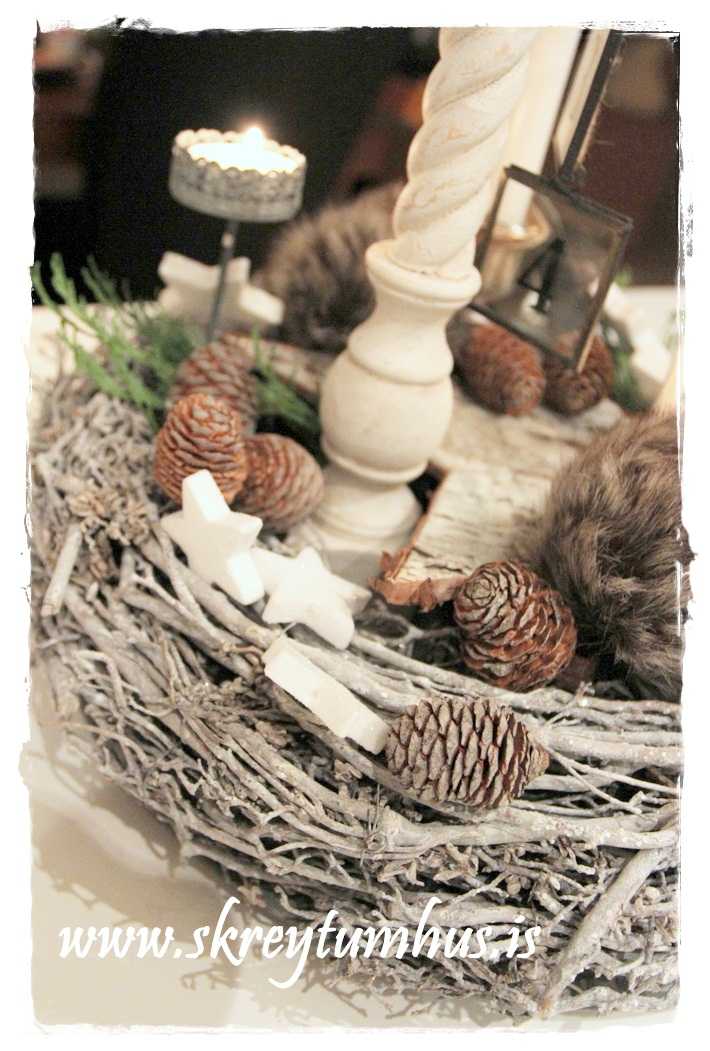 …fallegi grái kransinn mættur til leiks, og ég festi á hann kertin og kertahúsið, ásamt því að setja börk hér og þar…