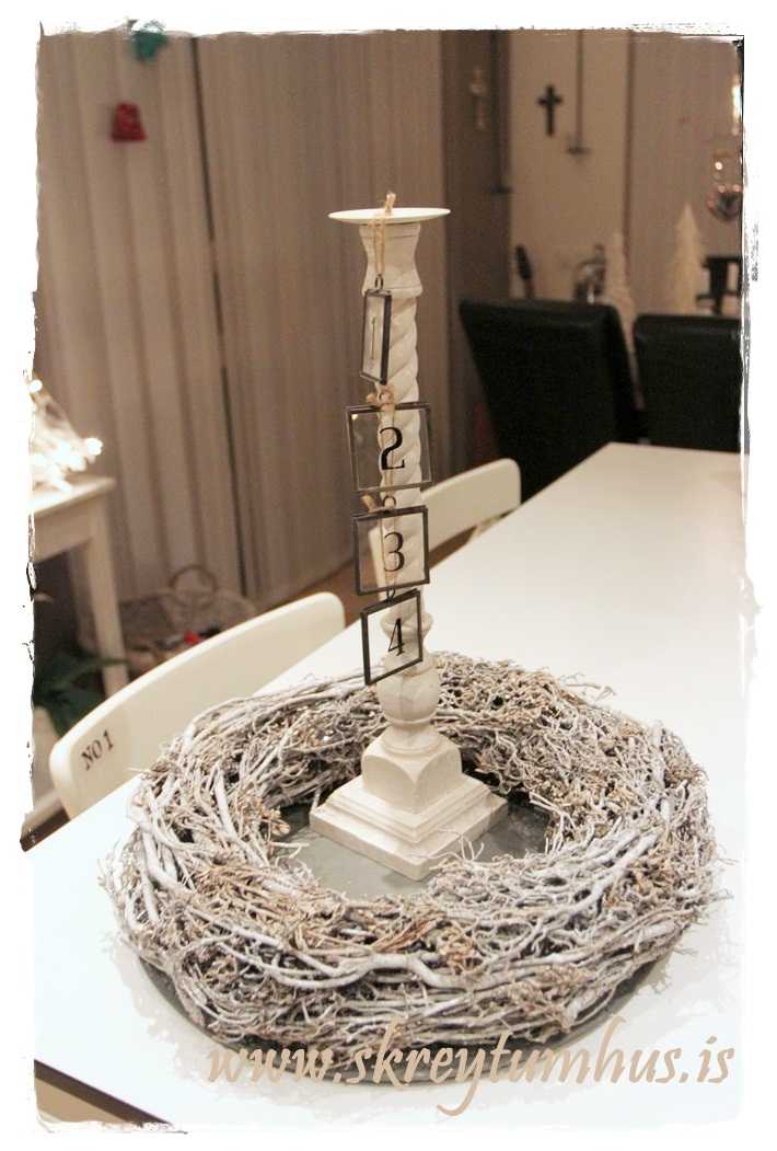 …ég festi síðan 1 – 2 – 3 og 4 á hvern annan og notaði háann stjaka inn í kransinn,