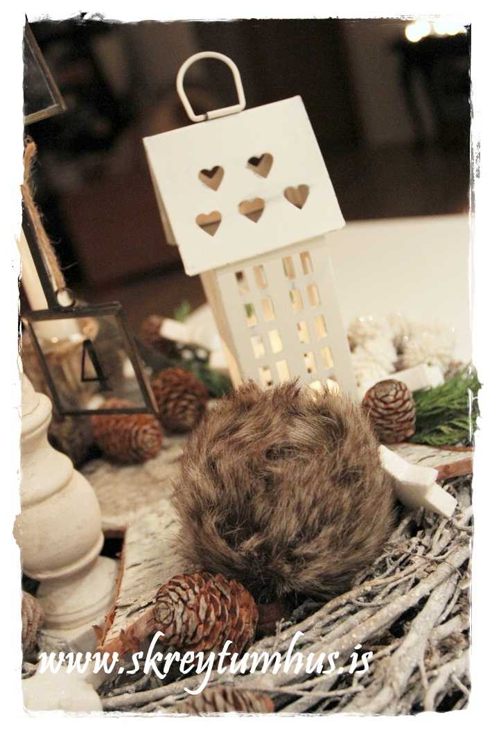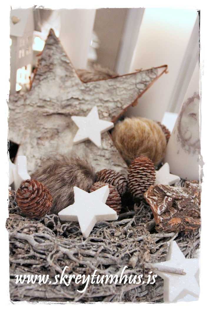 …og eftir að hafa sett skinn-jólakúlurnar á rétta staði, ásamt stjörnum og gammel mynd, og örlítið af thuja-greni sem að ég átti þá var þessi hérna fæddur: