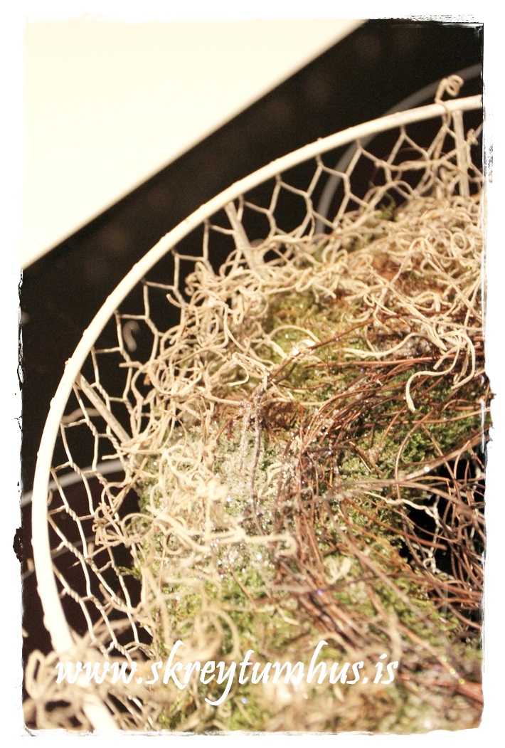 ..síðan var litla skrautinu bætt við í litlar grúbbur og glermerkin fest utan á vírkörfuna…
