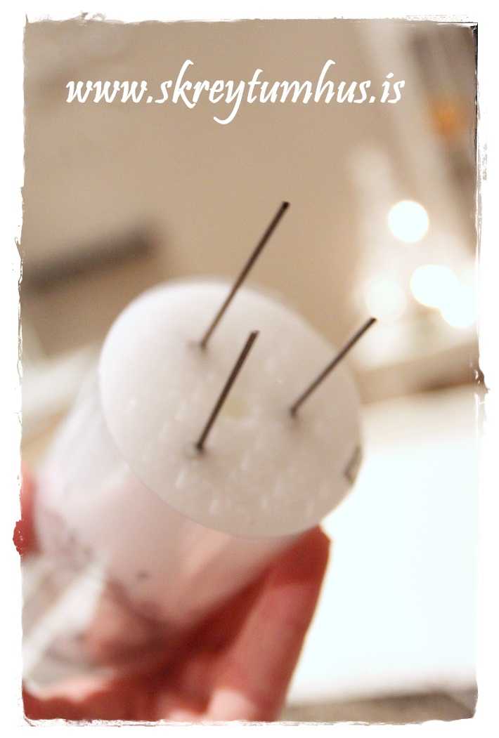 …grófur vír er klipptur niður í 3 grófa hluta og vírinn hitaður í kertaloganum, þannig er hægt að stinga vírbútum inn í hvaða kerti sem er og þannig hægt að festa kertin vel í kransinn…