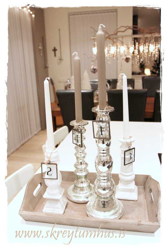 …kertastjakar á bakka með fallegu glertölunum…