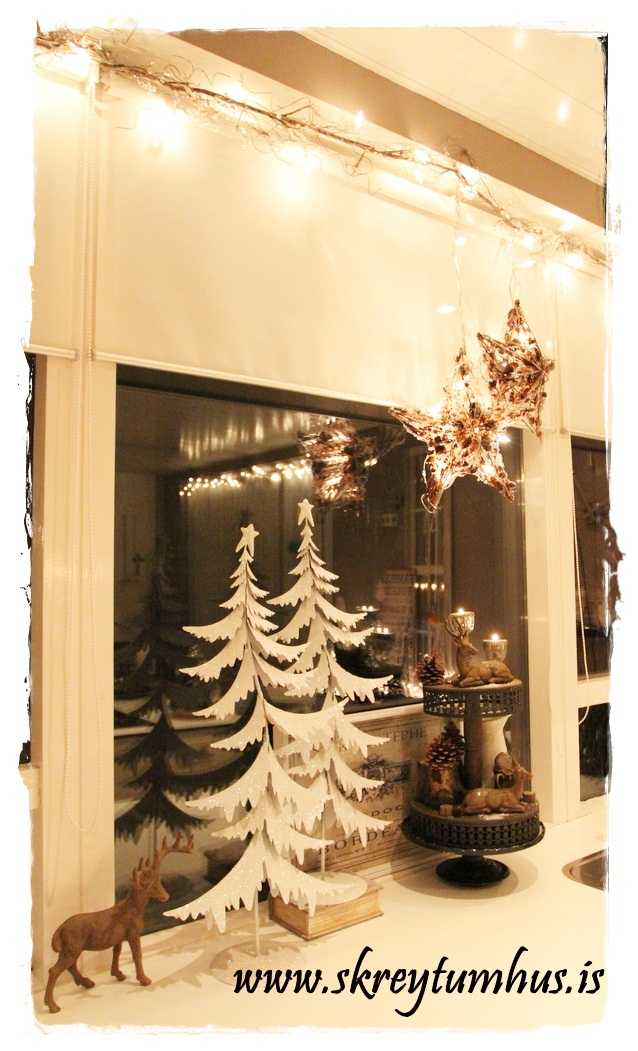 …ég fékk líka fyrirspurn um hvernig ég skreyti gluggana og það er einmitt svona. Best í heimi er að kaupa, að mínu mati, glærar seríur – sem sé glærar snúrur og hvítar perur. Síðan finn ég einhverjar fallegar lengjur, urmull af þeim fæst t.d. í Blómavali, og ég vef síðan glæru seríunum utan um. Mér finnst það alltaf vera fallegra en að festa bara seríu allan hringinn….