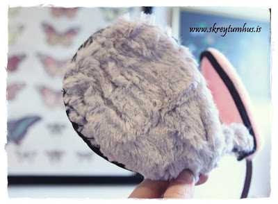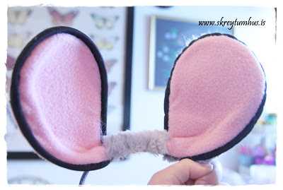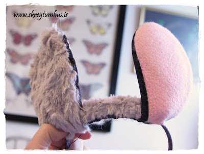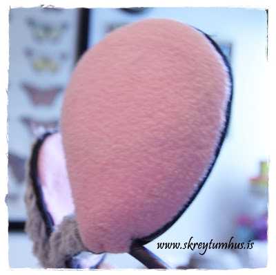 …hin eyraskjólin voru svona bleik með svartri líningu.  Ég klippti göt og þræddi hárspöng í gegnum skjólin, síðan tók ég loðið efni og saumaði yfir bakhliðina og líka á milli eyrnanna…