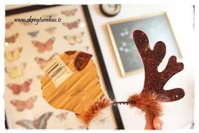…fyrir Mikka Ref þá saumaði ég tvo þríhyrninga saman og þræddi þá bara yfir hreindýrahornin, og það var nóg til þess að þau stæðu upp í loftið, síðan var restin af efninu notað í skott…