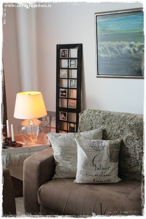 …ég notaði í raun sölu aðferð við að mála rammann, eins og kertastjakana hér fyrir ofan, eða gætti þess bara að beita penslinum létt og að láta málninguna ekki þekja alveg. Þannig fékkst svona grófur/gamall fílingur og núna stendur þessi elska bara í stofunni og gleður mig…