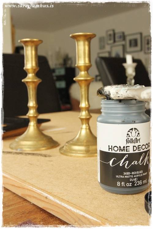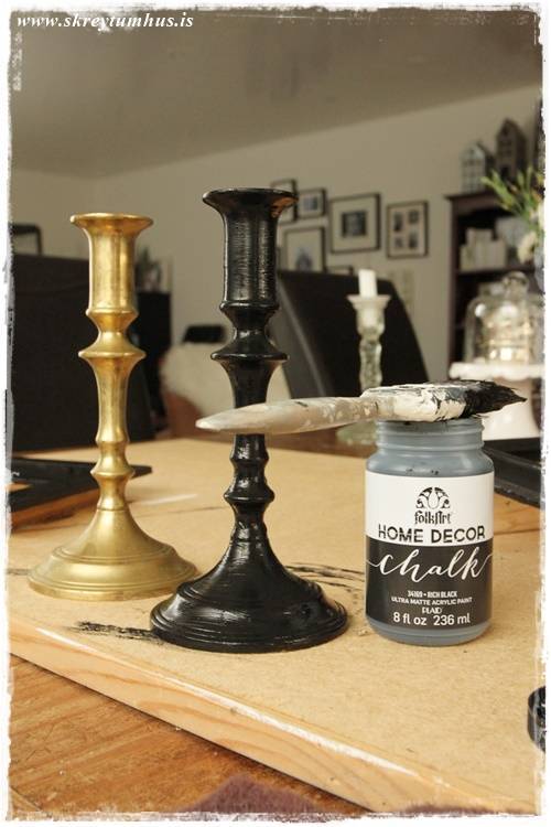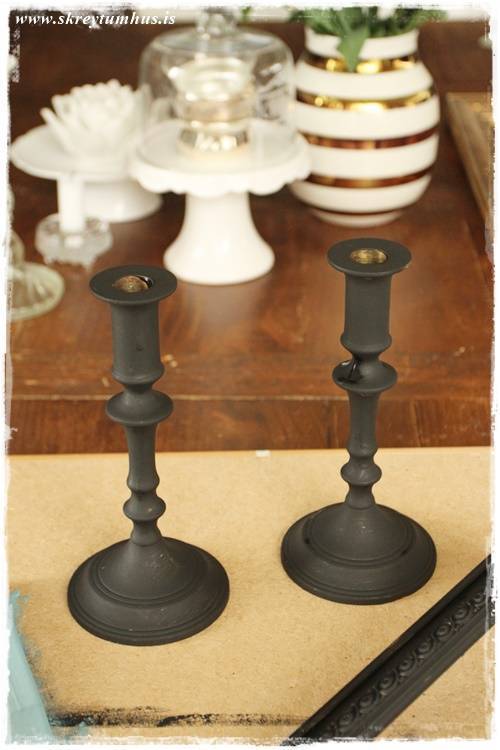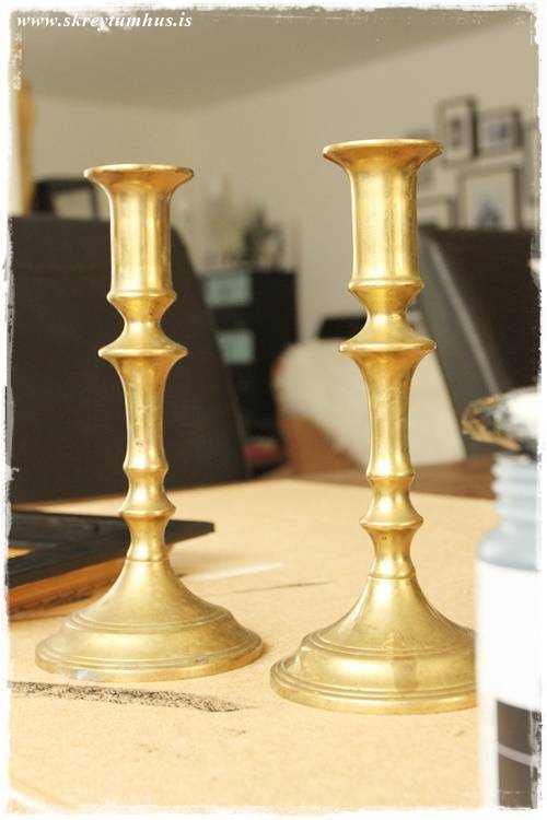…svona stjakar fást í þeim Góða og öllum helstu nytjamörkuðum landsins. Þeir eru ósköp fallegir svona, en bara pössuðu ekki hérna hjá mér. En þar sem þeir eru sérlega massífir og þungir, þá ákvað ég að gera eitthvað í málunum, enda á ég varla nema rétt um milljón kertastjaka þannig að mér veitti nú ekki af tveimur til viðbótar…
