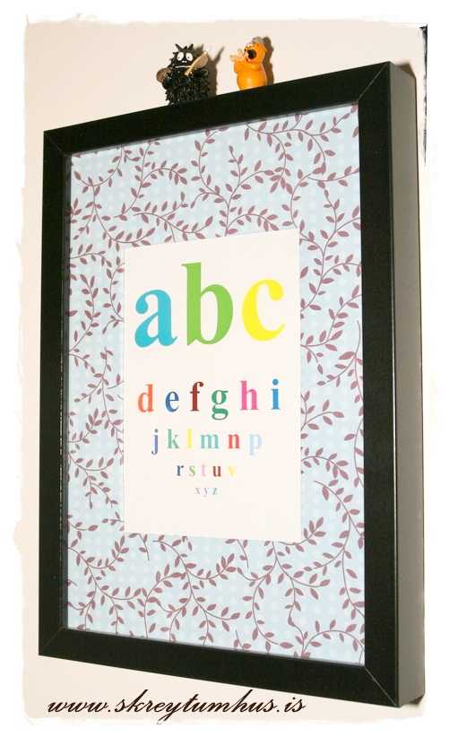 …stafrófið prentað í mismunandi litum og karton klætt í pappír…