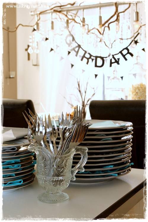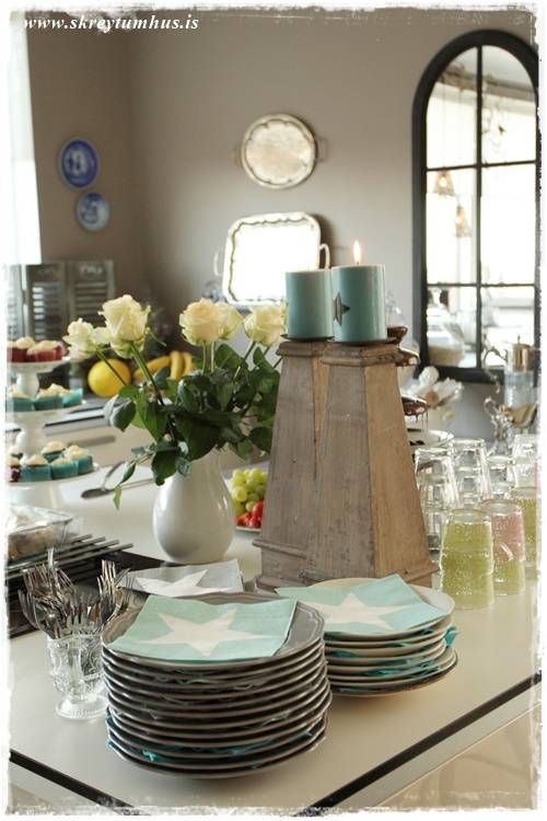 …að nota lítið glas eða könnu, eins og hér, er skemmtileg leið til þess að stilla upp göflum. Þessa litlu keypti ég í Rekstrarvörum fyrir skírn dóttur okkar, sem sé 2006 og þeir hafa verið endalaust notaðir síðan. Frábær fjárfesting fyrir þá sem eru svo heppnir að eiga svona stórfjölskyldur sem koma í veislur – held að ég hafi keypt 50 stk, enda eru það milli 40-50 manns sem mæta í afmæli hjá okkur…