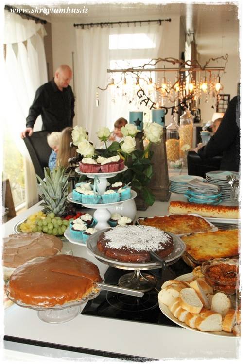 …það var bara rétt að það sæist í borðplötuna á milli diskanna – rjómatertur og karamellukökur…