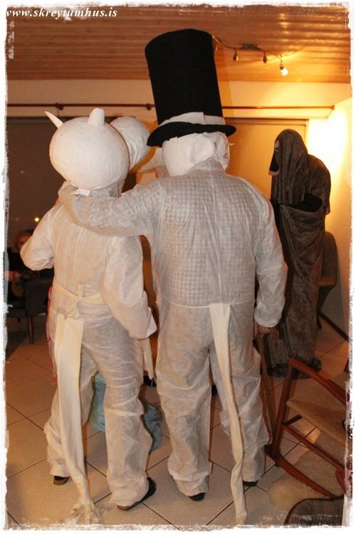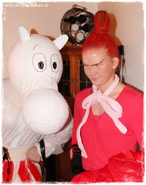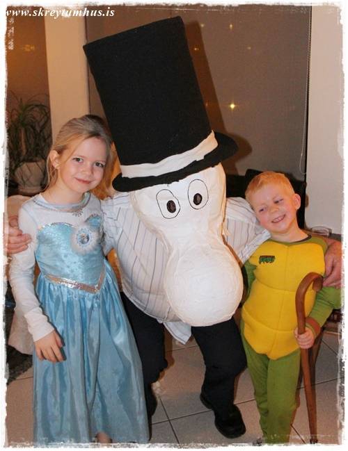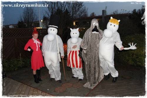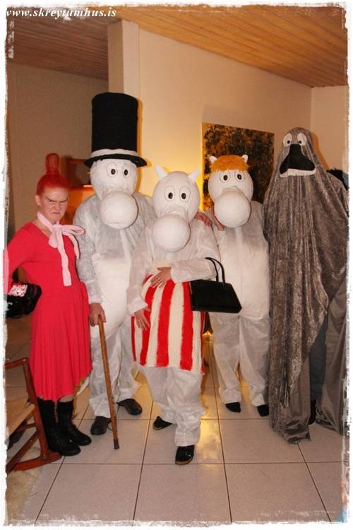 Systir mín og hennar famelía komu í heimagerðum Múmín-búningunum, sem sé Mía litla, Múmínpabbi, Múmínmamma, Morrinn og Snorkstelpan. Svo bara til þess að vera auðvitað flottust, þá kom tónlistin úr þáttunum beint úr bumbu Múmínpabba…