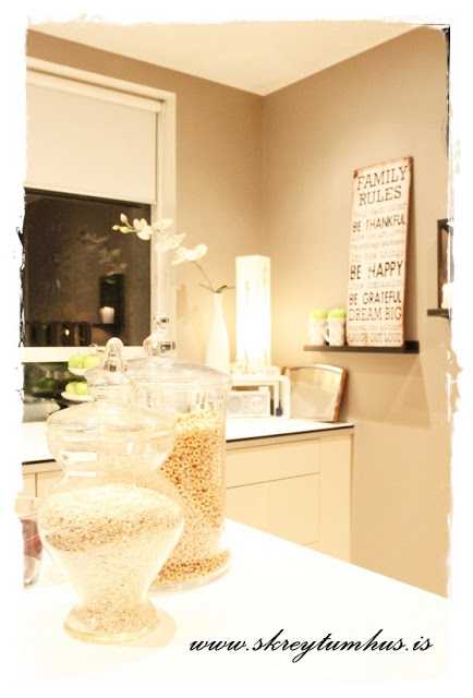 Ég er sem sé búin að ganga með það lengi í maganum að mér langi til að mála hérna í alrýminu (eldhús, stofa, borðstofa). Síðan þegar að krílin voru sofnuð á þriðjudagskvöldið (og kannski bara kallinn líka) þá ákvað ég bara að stökkva af stað og ljúka af þeim veggjum sem ég var alveg ákveðin í.