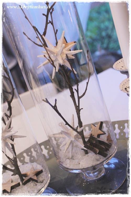 …þannig að glerkrukka með greinum, smá glitrandi stjörnum, tréstjörnum sem ég átti fyrir og dass af snjó – og la voila…