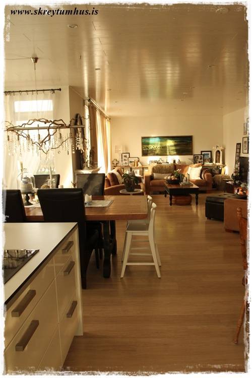 …fyrst af öllu – hérna stend ég inni í eldhúsi og horfi alla leið inn í stofu. Eins og þið sjáið þá er þetta stórt og langt rými og það sem mér finnst svo gott við hillurnar er að það “dregur það saman”. Ef það skilst…