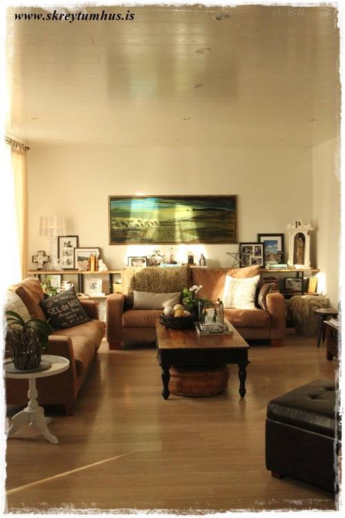 …og svona er þetta þegar að sófinn er á sínum “venjulega” stað, það sést í hillurnar en hann nær að fela tímaritin og annað slíkt…