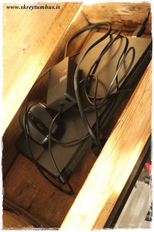 …þessi ævaforni gamli bakki bíður eftir að fá pláss sem hæfir hans virðingarstigi, en í bili kúrir hann í hillu og bóndinn geymir tölvudót í honum á meðan….