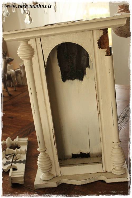 …það kom nefnilega auglýsing inni á Skreytum Hús sölugrúbbunni um daginn, þar sem kona var að selja gamla málaða veggklukku. Klukkan hafði dottið í gólfið og var ansi löskuð – en það var einmitt það sem mér fannst svo fallegt við hana…