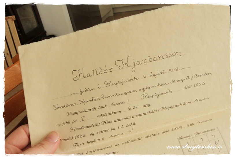 Halldór Kjartansson, fæddur 6.sept 1908 og í umslaginu var prófskirteinið hans frá Lærða Skólanum í Reykjavík, útskrifaður 1929…