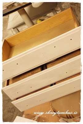 …Skref 5 – síðan var málað yfir aftur með grunninum, og ég held meira að segja að ég hafi farið tvær umferðir yfir skúffurnar, eftir að þær fengu sandpappírun eftir “fría áfyllingu”…