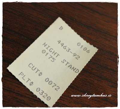 …eeeen yfir í baksöguna.  Ég tala stundum um að það sé svo gaman að eiga hluti með sögu, en það er ekki oft sem maður fær hluta af sögu hlutanna með í hendurnar.  En það gerðist í þessu tilfelli.  Skúffurnar eru þannig að það er heil plata á milli hverrar skúffu, þannig að þegar ég tók þær út þá fann ég bunka af blöðum.  Fyrst var þetta, verðmiði fyrir væntanlega þessa kommóðu, og staðfesting á að þetta á að vera náttborð, vúúúúhúúú 😉