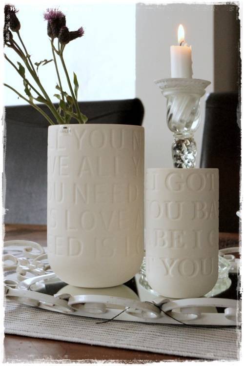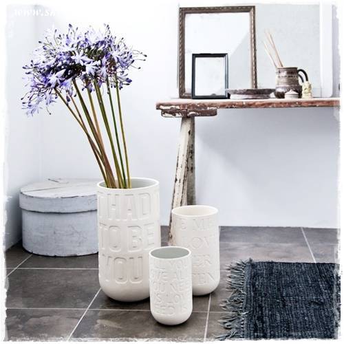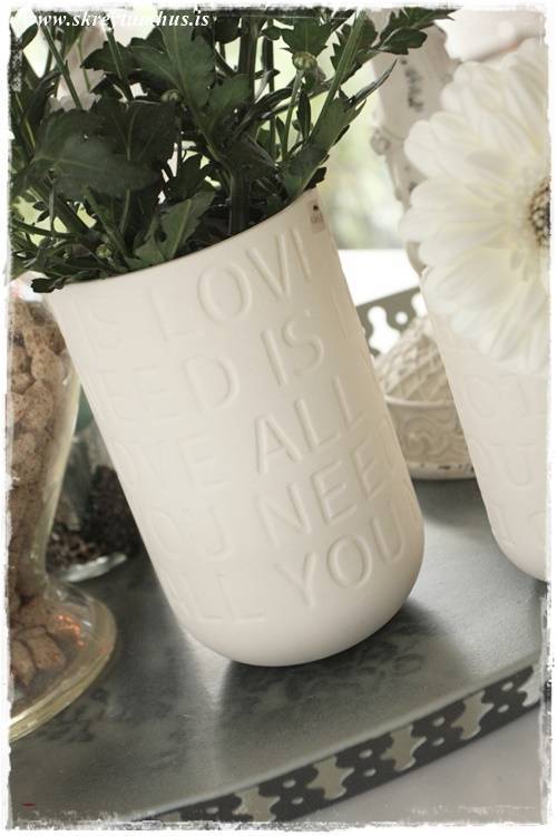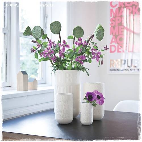 Síðan er það svo skemmtilegt að það er mismunandi litur sem hægt er að fá á glerunginum. Sem sé bara hvítur, eða neutral eins og vasinn, eða fölbleikur, fölblár og fölgrár. Textinn er síðan stimplaður í vasann að utanverðu, þannig að hann look-ar mjög einfaldur en er svoooooo fallegur…