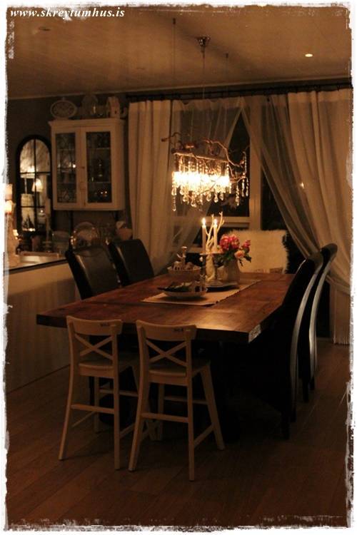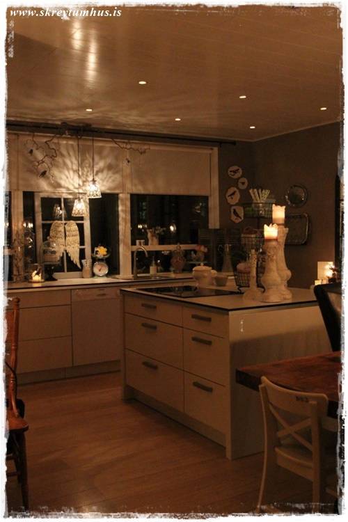 …auðvitað kveikt á stóru kertunum á eyjunni.  Enda lýsa þau eins og nokkurs konar vitar – hvernig ættum við annars að vita hvar eldhúsið væri…