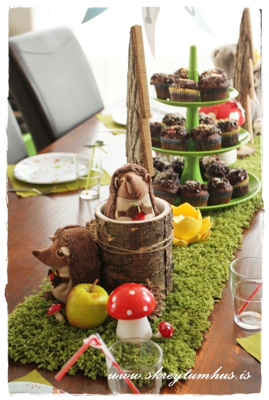Þar sem þetta var svona skógarþema setti ég engan dúk á borðið, þannig að brúnn viðurinn fengi að njóta sín…