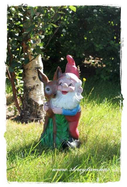 … úti í garði stendur hann Álfur knúsandi besta vin sinn. Venjulega er ég með garðálfa-fóbíu, en þessi gamli fékk sérstaka undanþágu og eiginlega komst hann í gegn út af vini sínum, en þeir eru sætir saman – og litli maðurinn elskar þá alveg 🙂