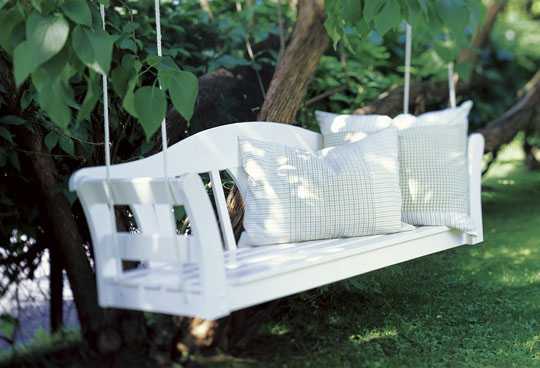 …hver vegna ekki að nýta sér bekki, taka af þeim lappir og útbúa rólu…