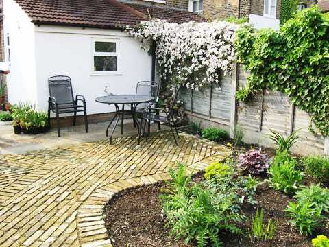 …skemmtilegt samspil, hellur, tré og beð…