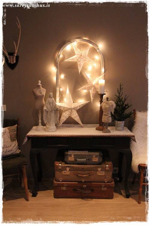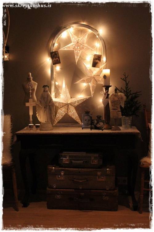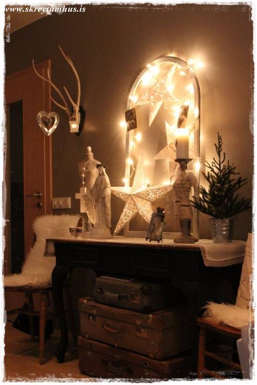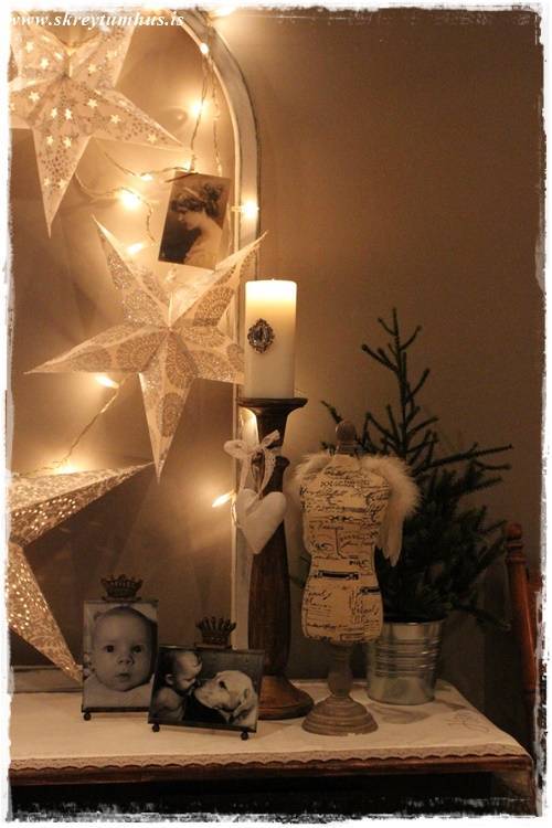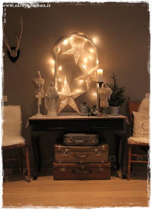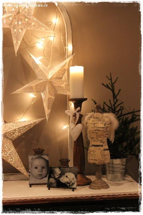 Síðan var ég að stússa hérna heima og þær bara duttu úr pokanum hjá mér, og svo datt óvart sería úr kassa í bílskúrnum, og þá var ekkert aftur snúið 🙂 Smá dass af jólum, en samt ekki, jú sí!