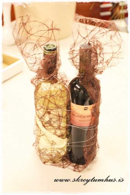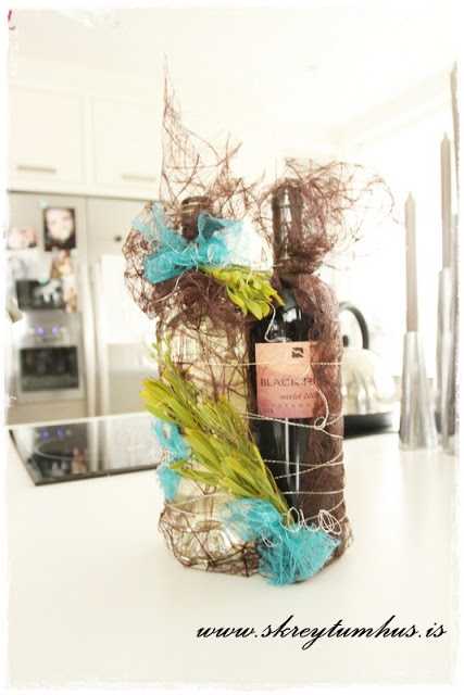 …tekur gróft efni og vefur utan um flöskurnar og festir með vír.  Vírinn er líka gróft vafinn á tvist og bast, easy peasy…