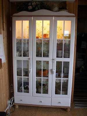 Upp í sumarbústað á ég þennan furuskáp, sem keyptur var í RL Vöruhúsi. Hann málaði ég með veggjamálningu, nema hillurnar. Hann er ekkert sérlega vel málaður, enda má hann vera soldið “shappy”.