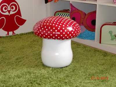 Ég keypti þennan koll af þér og setti stóra græna mottu úr IKEA undir svo það líti út eins og sveppur á grasi (svipað og þú gerðir í smækkaðri mynd í afmælinu hjá stelpunni þinni) 🙂