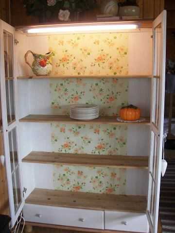 Þegar ég sá svo hjá þér landkortin sem þú settir í bakið á þínum skáp, varð mín alveg sjúk. Ég setti þennan gjafapappír úr Eymundson á bakið með teipi, lét bar breiddina á honum ráða.