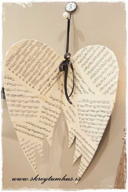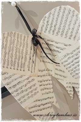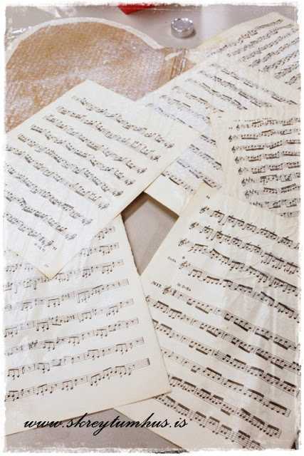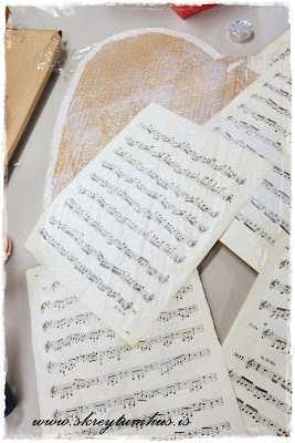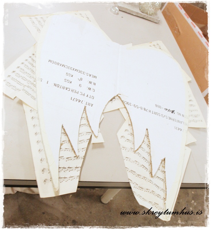 3.  Síðan penslaði ég Mod Podge yfir vænginn og svo var bara að leggja nótnablöð yfir…