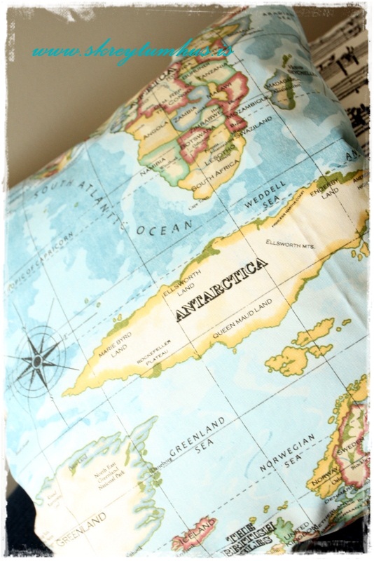 …við gættum þess að taka nóg efni til þess að eiga í púða, og gott tips, til að spara efni er að nota bara flotta efnið að framan og annað og einfaldara í bakhliðina…