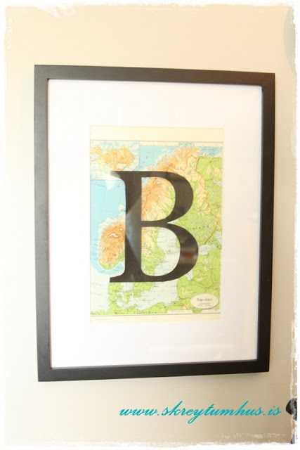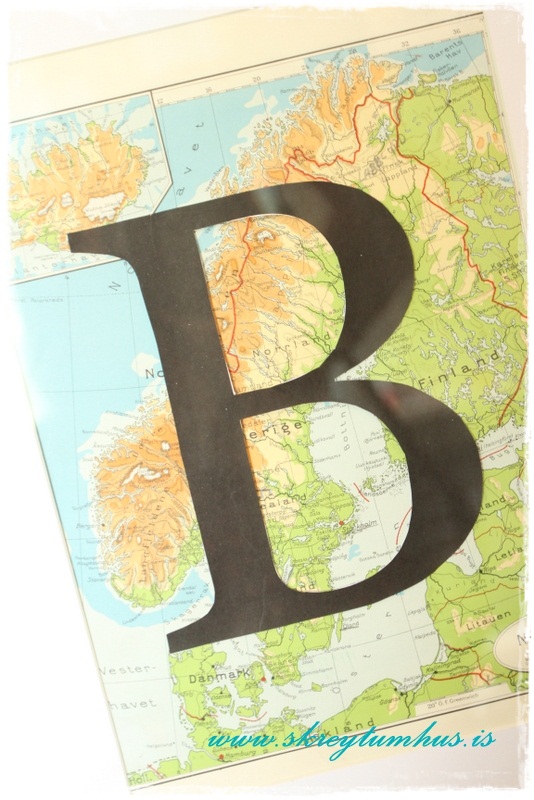 …B-ið fyrir ofan skrifborið útbjó ég, fann gamla landakortabók og tók kortið úr, prentaði út B í réttri stærð hérna heima og klippti það síðan út.  B-inu er bara límt ofan á kortið – einfalt og hrikalega flott þó ég segi sjálf frá 🙂