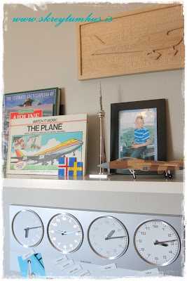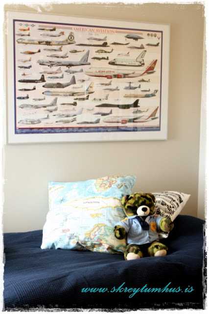 …flugvélamyndin var til áður og við notuðum hana áfram, rúmteppið er úr Ikea…