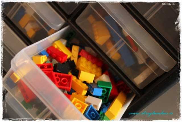 …síðan hérna fékk ég hugmynd sem að ég held að sé barasta pínu snilld!  Í gauraherbergi, þar sem er tæknilegó og alls konar kallar með ýmiskonar litla fylgihluti þá eru svona skúffuhirslur (fást í Byko og Húsó og svona stöðum fyrir skrúfur og smádóterí).  Körfurnar flottu sem eru undir hillunni fengust síðan í Rúmfó…