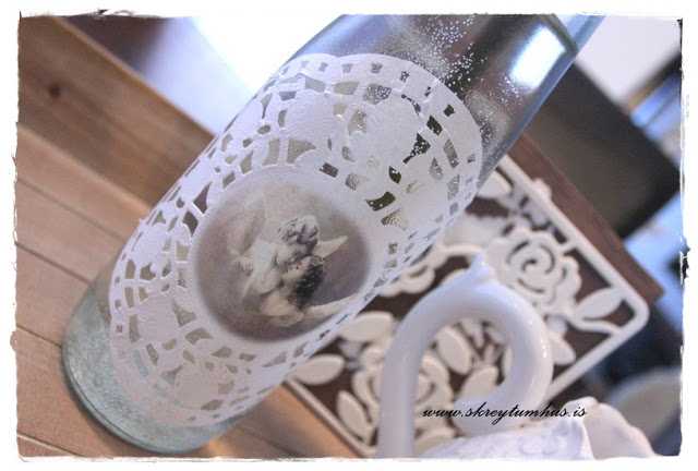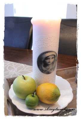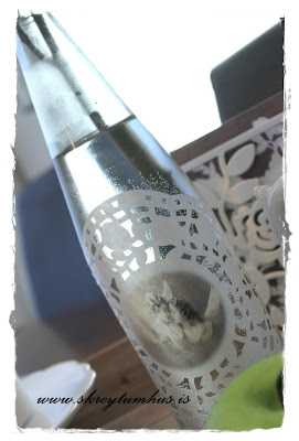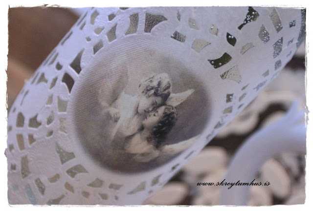 og eftir meðferð með kertaefni sem ég keypti í Föndru, þá er blúnduverkið núna komið á kertið.