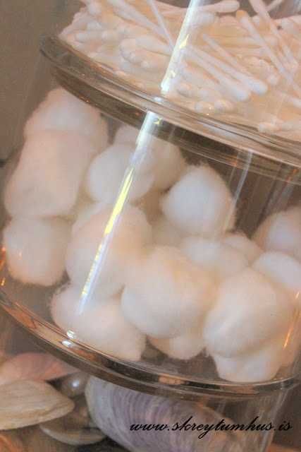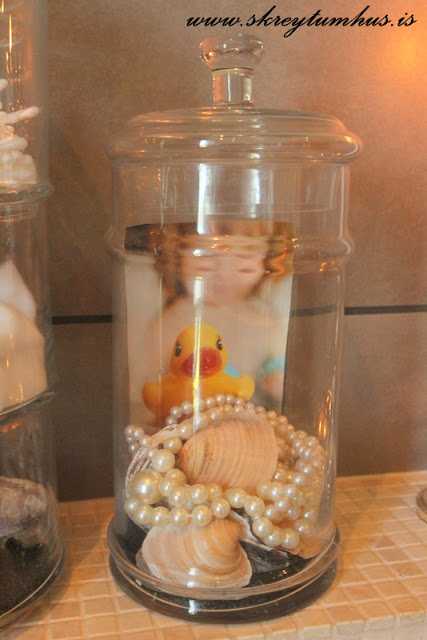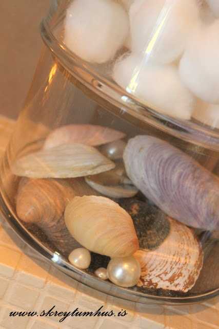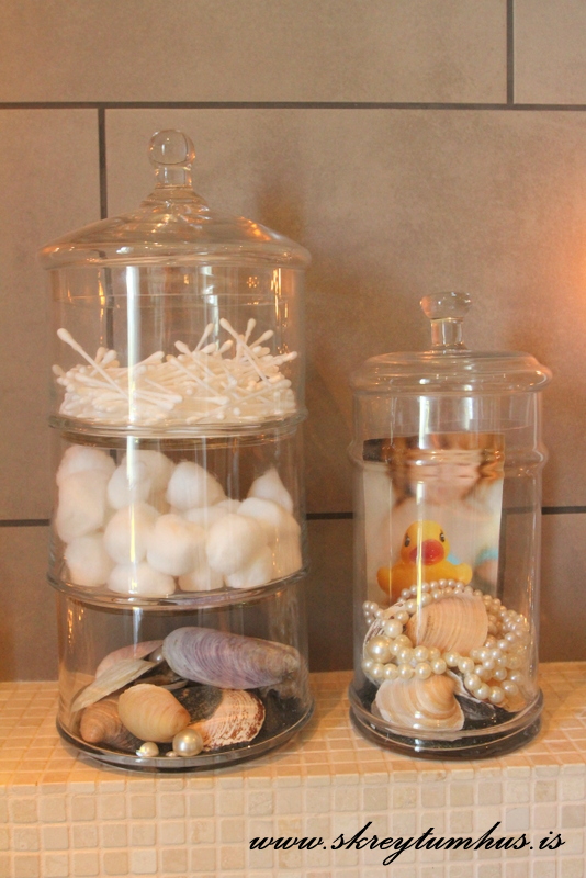 Ég á litla krukku sem ég er búin að vera með inni á baði í svolítin tíma 🙂 Er einmitt með bómull og eyrnapinna og svo baðsalt 🙂 En er rosalega hrifin af skeljunum og perlunum 😉
