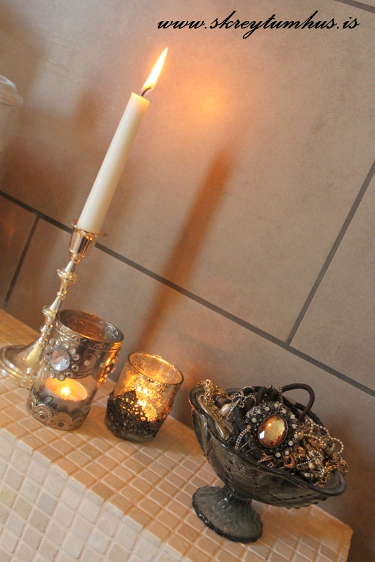 Þar að auki safnaði ég saman glærum og silfur kertastjökum, ásamt nokkrum litum kertaglösum…
