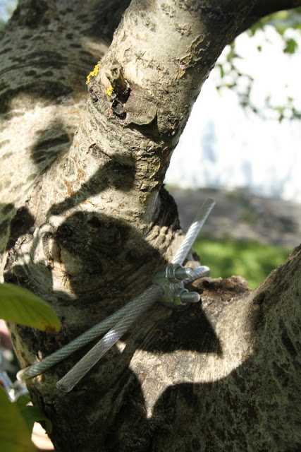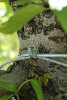 …fórum í Húsó og keyptum þar plasthúðaðann stálvír og skrúfuðum á hann festingar og settum síðan bara svona klemmufestingar þannig að hægt er að taka það auðveldlega niður…