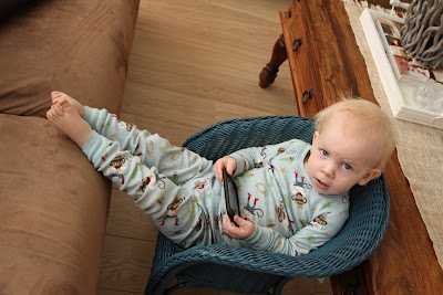…síðan er hann komin með svona ríka “tískuvitund”, hver hefur ekki lent í að vera með öfugan hjálm, í samfellu og stígvélum 🙂 Hver lendir ekki í því? Svo er hann með “drusluna sína” (náttkjóll af mér sem hann dregur með sér um allt), Klossa og Dóru, og auðvitað líka kex – einn við öllu búinn!