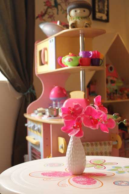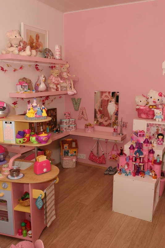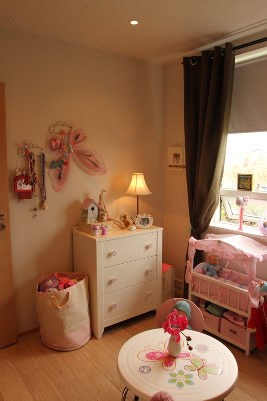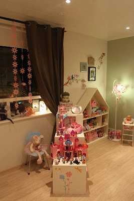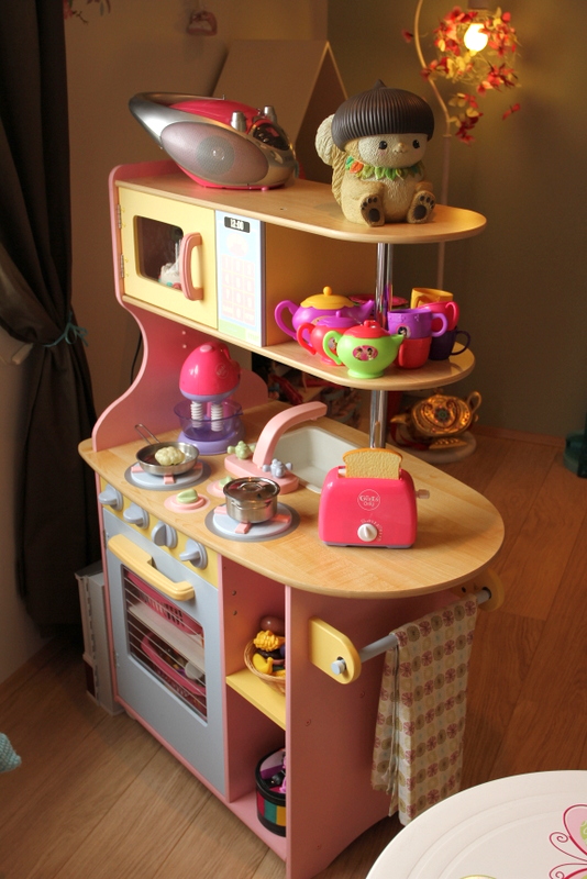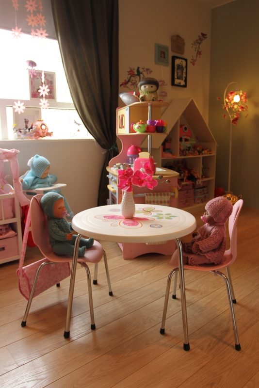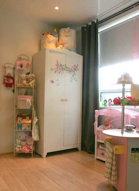 …og þegar að fyrstu lotu lauk (áður en hengt var uppá veggi og gengið frá smáatriðum) þá setti ég eldhúsið hennar aftur inn í herbergið, en eftir að daman kom heim þá tillkynnti hún mér að hún væri sko alveg að verða 6 ára og væri bara hætt að leika með dúkkur ( með öðrum orðum, út með eldhúsið og það sem því fylgdi )…