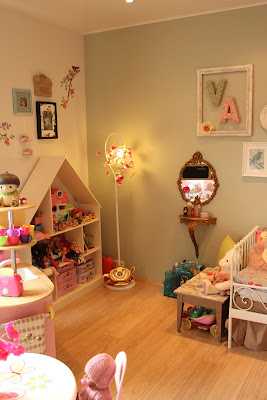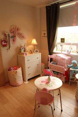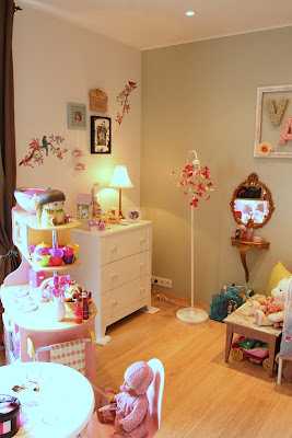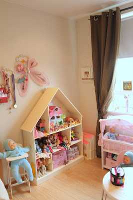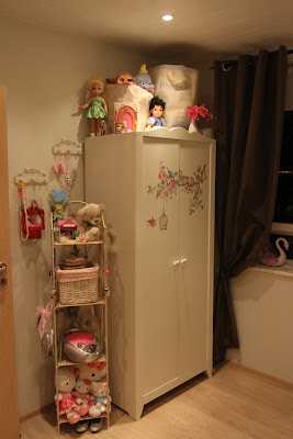 …en núna eru dúkkur að koma inn aftur, og eru búnar að vera í miklu uppáhaldi í nokkra mánuði þannig að eldhúsinu var kippt út úr geymslunni, ásamt borði og stólum og dúkkurúmi. En ég vildi færa skápinn frá glugganum og ég prufaði því að færa dúkkuhúsahilluna yfir á vegginn þar sem skápurinn var áður og færði svo kommóðuna yfir á vegginn sem dúkkuhúsahillan var áður…